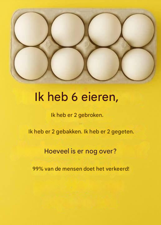 "Ik heb 6 eieren. Ik heb er 2 gebroken. Ik heb er 2 gebakken. Ik heb er 2 opgegeten. Hoeveel eieren heb ik nog over?"